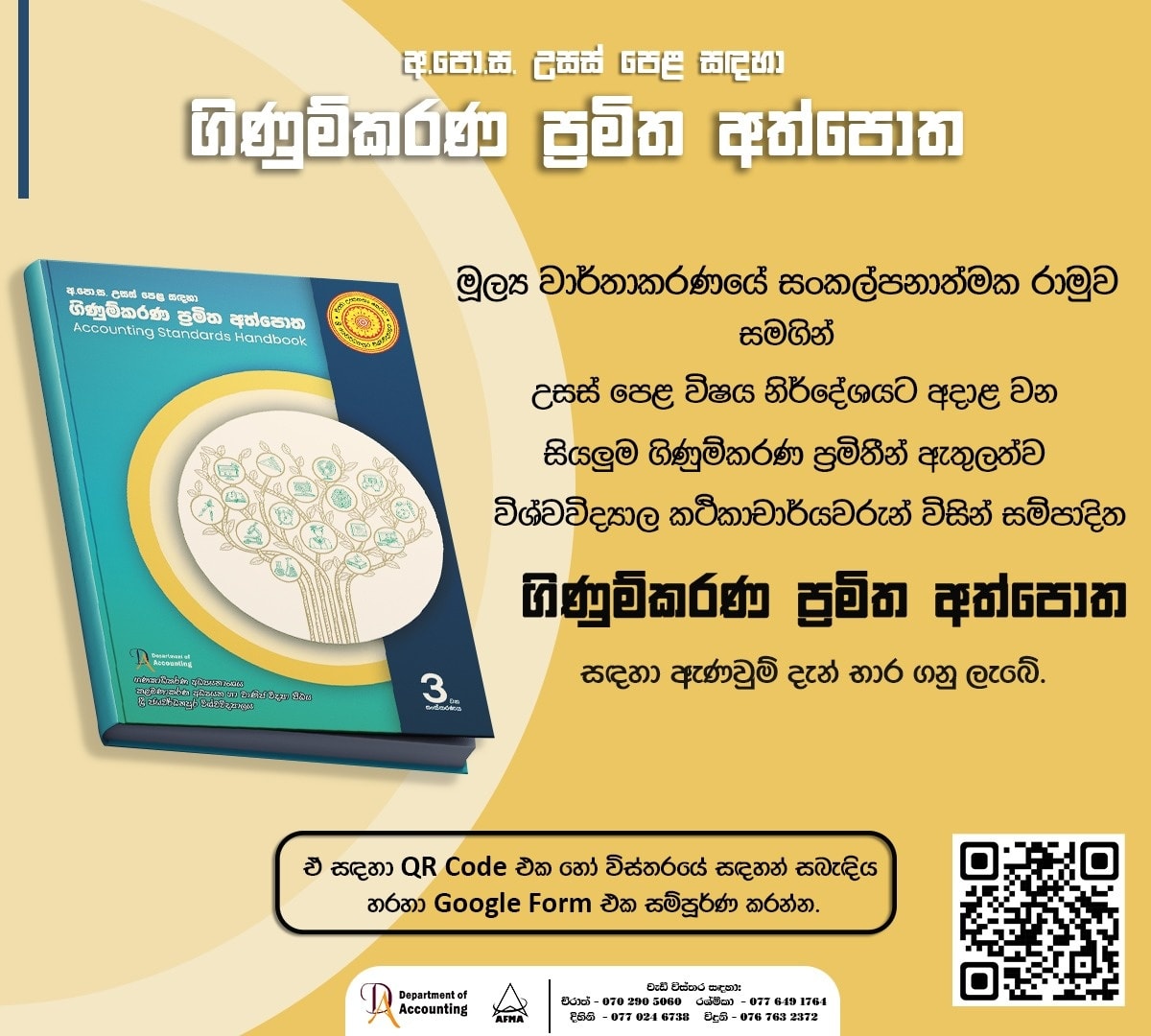 ශ්රී ජයවර්ධනපුර විශ්ව විද්යාලයේ කළමනාකරණ අධ්යයන හා වාණිජ විද්යා පීඨයේ ගණකාධිකරණ අධ්යනාංශයේ කථිකාචාර්යවරුන් විසින් සම්පාදනය කරන ලද ගිණුම්කරණ ප්රමිත අත්පොතේ (Accounting Standards Handbook) තෙවන සංස්කරණය ලබාගැනීමට ඔබට දැන් හැකියාව ඇත.
