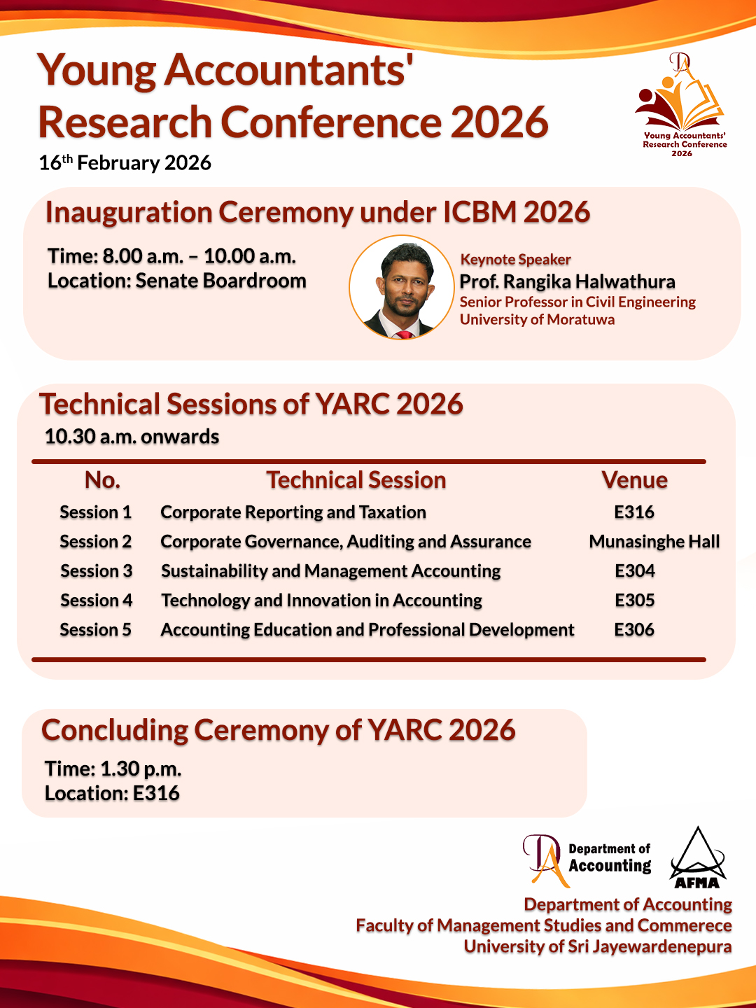 Prof. Rangika Halwathura, Senior Professor in Civil Engineering at the University of Moratuwa, served as the Keynote Speaker at the inauguration ceremony of the URD of ICBM 2026. At YARC 2026, a total of forty-one young accountants presented their research in five technical sessions on Corporate Reporting and Taxation, Corporate Governance, Auditing and Assurance, Sustainability and Management Accounting, Technology and Innovation in Accounting, and Accounting Education and Professional Development. At the concluding ceremony of YARC 2026, Prof. Dileepa Samudrage, Head of the Department of Accounting, addressed the gathering.