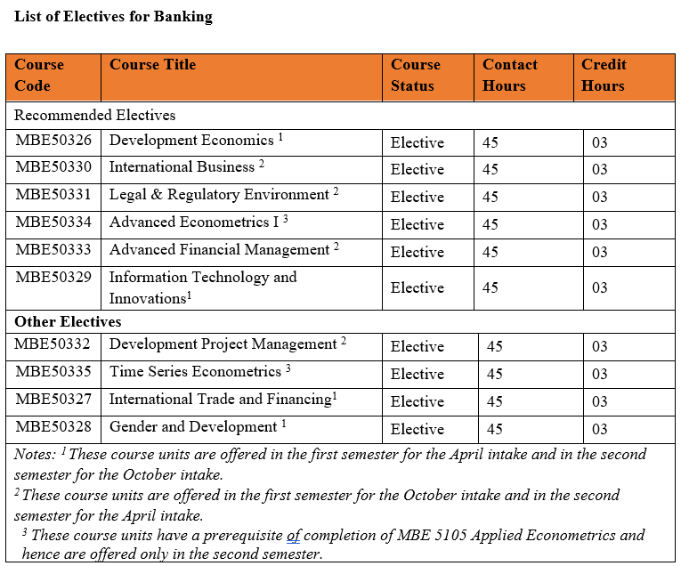 Students are required to complete three core course units and select two elective courses from the list provided in the table below. When choosing electives, they must ensure that at least one course unit is selected from the recommended electives in the table below. |