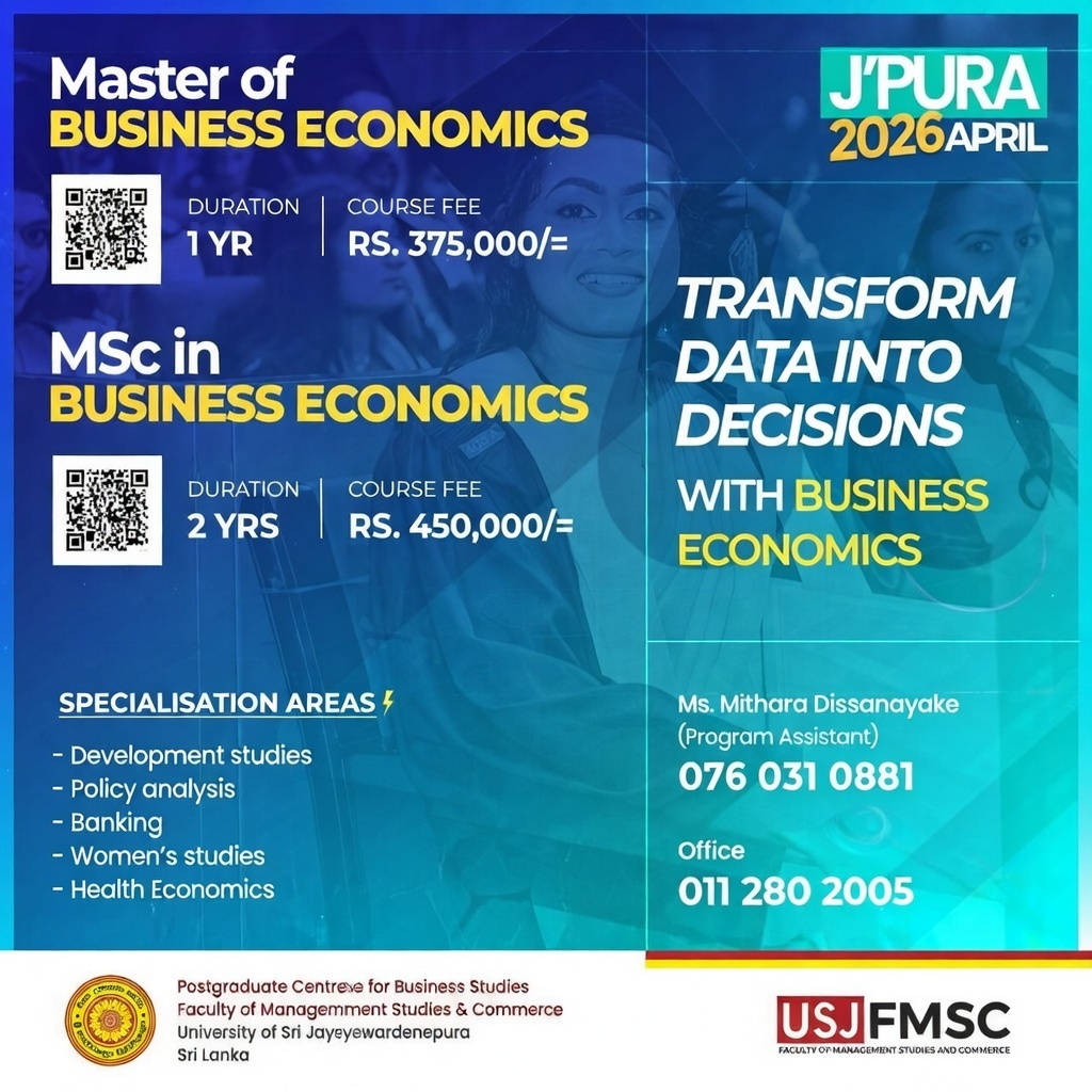 M.Sc. programme is a two years Master’s degree programme which is equivalent to the SLQF Level 10. The programme has been structured in a manner that will benefit professionals from both the corporate and government sectors. This programme has been designed to enhance the theoretical and practical knowledge, analytical skills and research competencies of candidates.