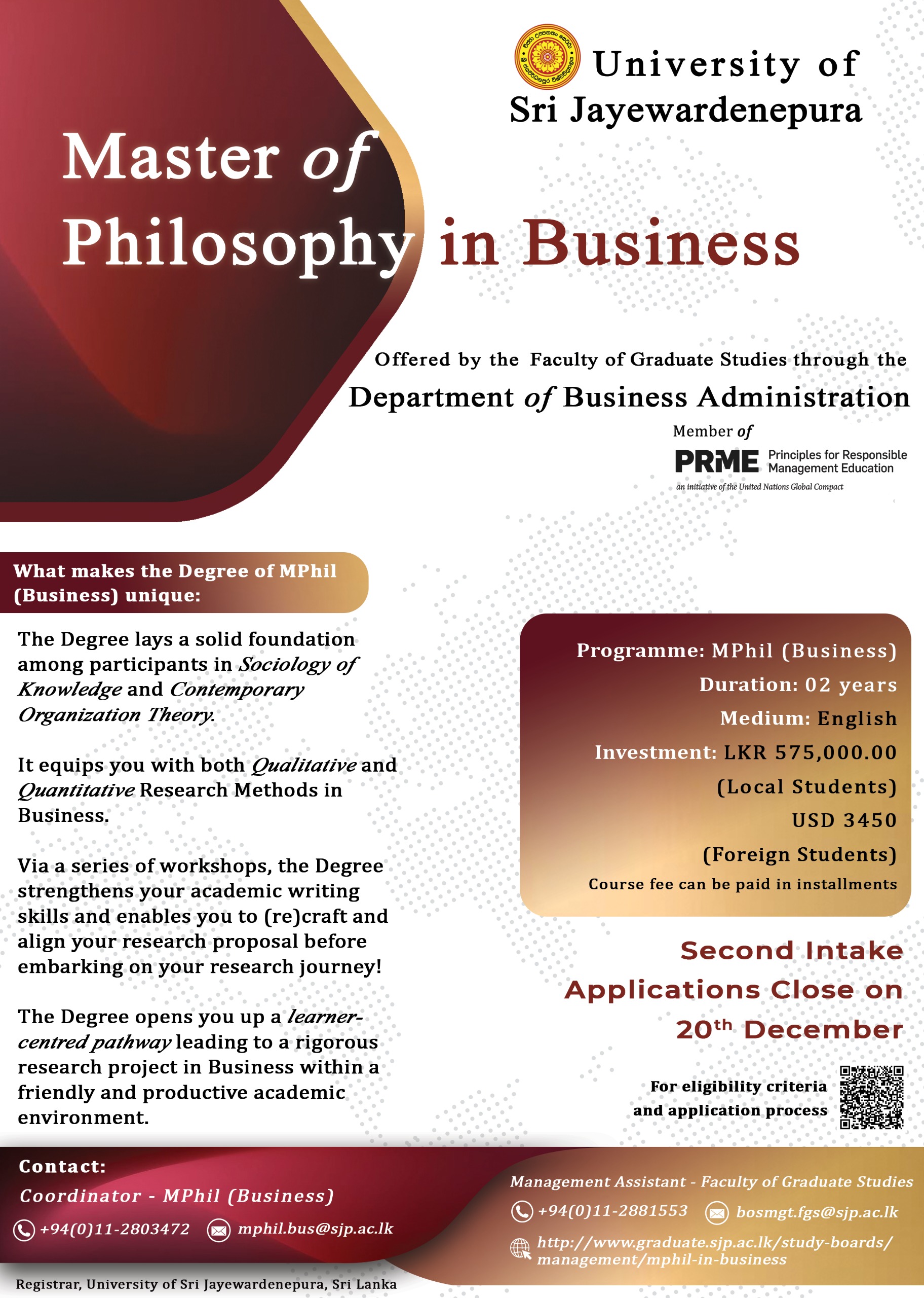 For applications, visit: Master of Philosophy in Business – New Admissions for Academic Year 2026 – Faculty of Graduate Studies – University of Sri Jayewardenepura