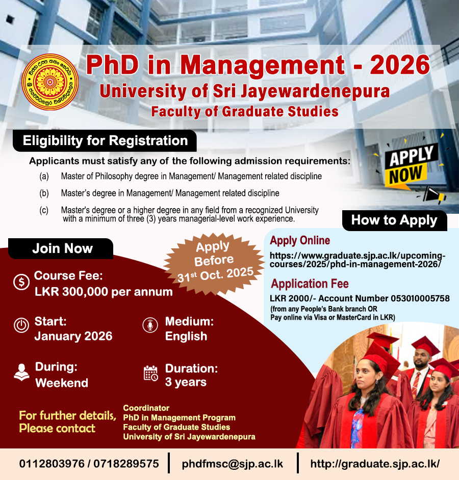 Don’t miss this opportunity to transform your future. For more details and application deadlines, visit https://www.graduate.sjp.ac.lk/upcoming-courses/2025/phd-in-management-2026/.