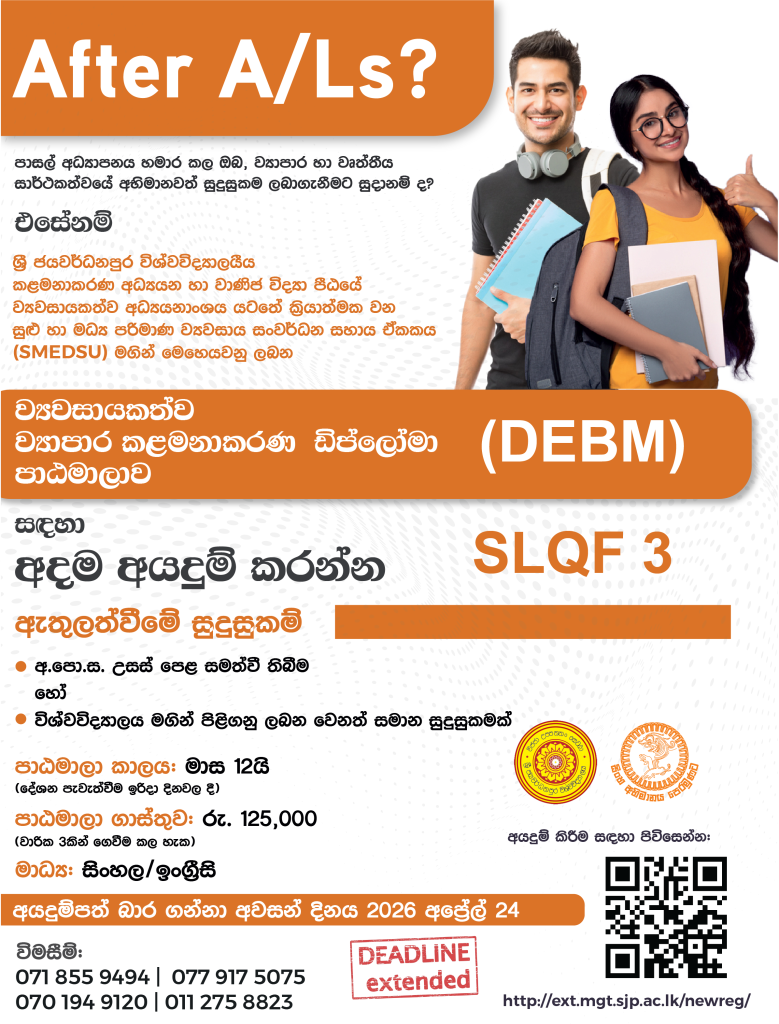 - A foundation course equivalent to SLQF level 2 after a minimum of 12 years of schooling, followed by passing an aptitude test,