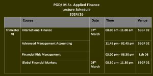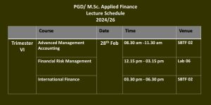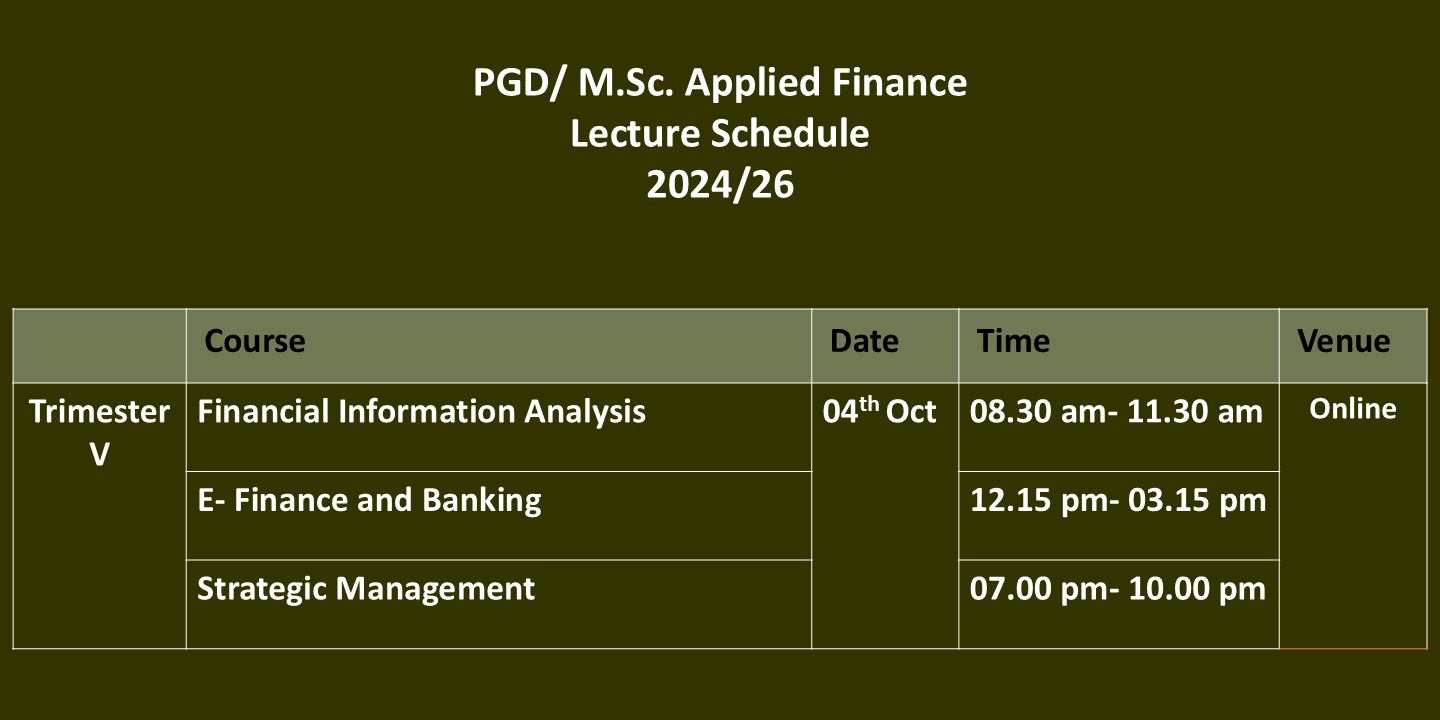 M.Sc. in Applied Finance is a practitioner- and career-oriented degree program specially designed for graduates, executives, and professionals in the discipline of finance. These postgraduate degree programs are conducted by the Department of Finance under the Faculty of Management Studies and Commerce. Postgraduate Diploma in Applied Finance (PGD AppFin) is offered as the exit strategy of the M.Sc. in Applied Finance (M.Sc. AppFin).