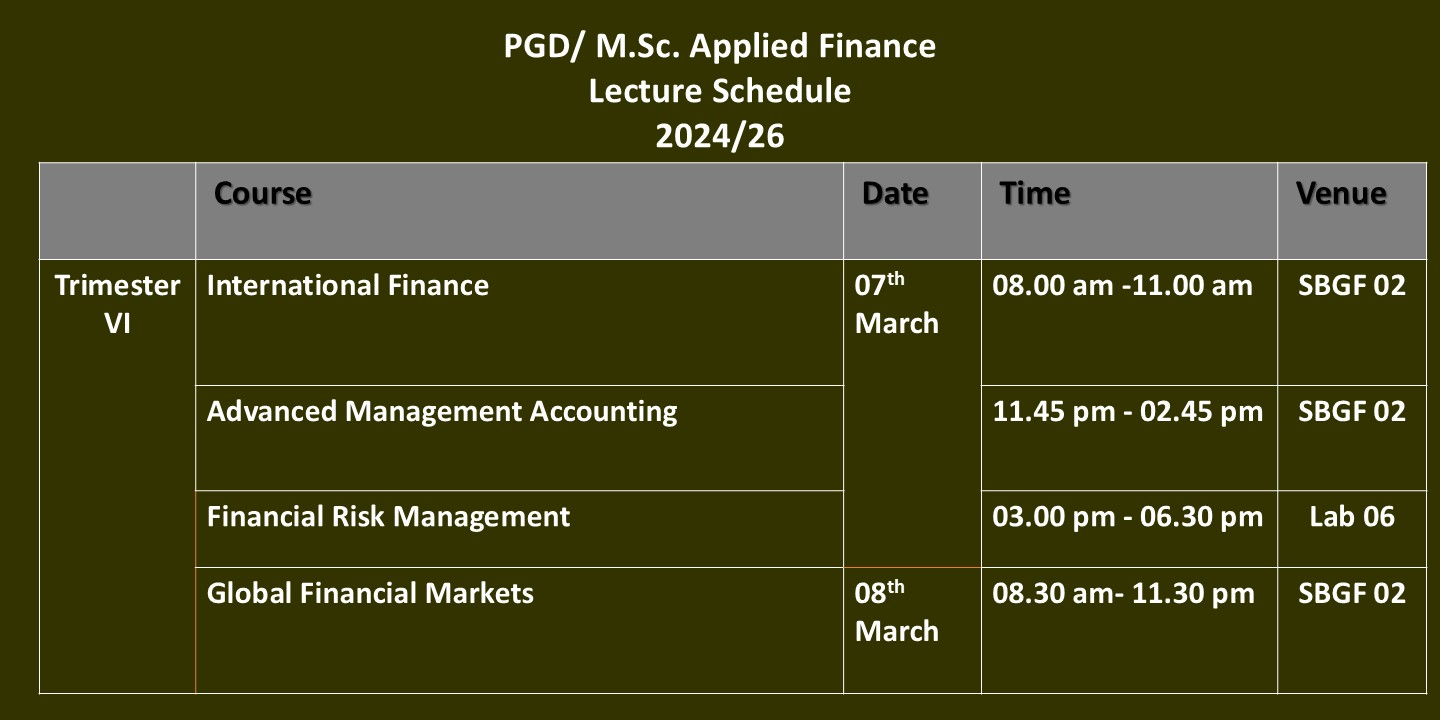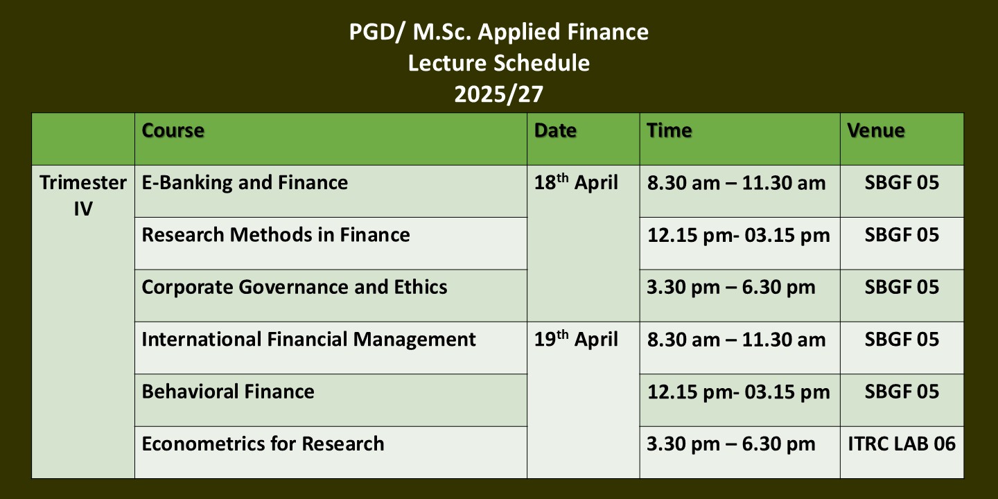 The programme of study includes two years. The first year consists of nine courses including electives. Each course carries three or four credit hours per week and fifteen sessions in a semester. Upon completion of the first year the student may obtain the Postgraduate Diploma in Applied Finance or proceed to the M.Sc. in Applied Finance degree program. The M.Sc. in Applied Finance degree program consists of six courses in the first two terms. In the third term student have the option of submitting the dissertation or studying for four credit courses. Those who select dissertation option should complete the dissertation within a five months period. On successful completion of both years the student is awarded M.Sc. in Applied Finance degree.
