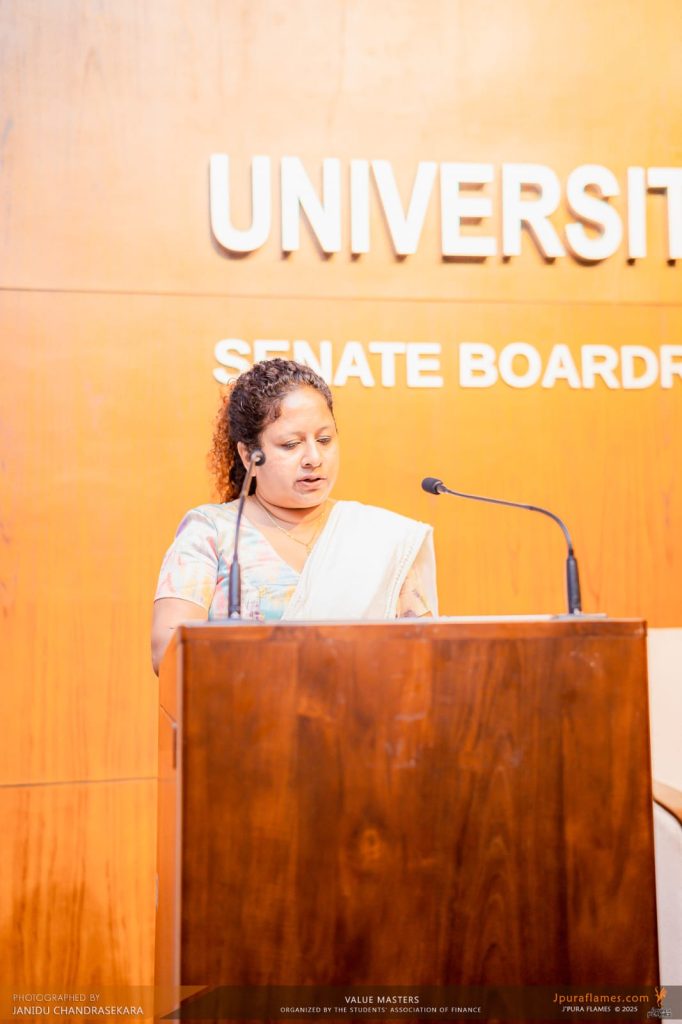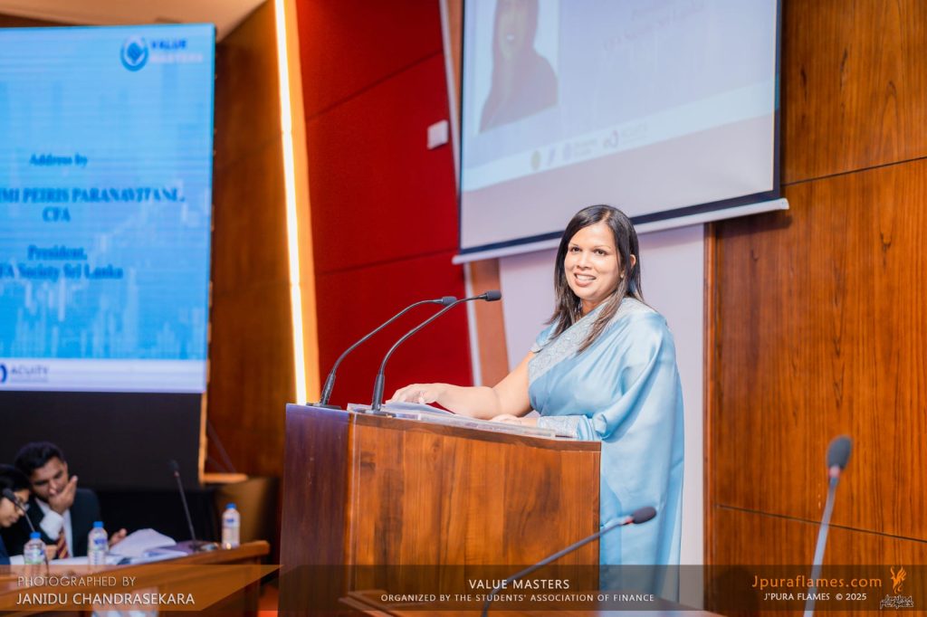 Delivering the welcome remarks, Dr. Neelangie Nanayakkara, Head of the Department of Finance, emphasized the significance of Value Masters as a platform that unites learning, application, and innovation. Ms. Rashmi Peiris Paranavitane, President of CFA Society Sri Lanka, also addressed the gathering, underscoring the importance of ethics and analytical discipline in the finance profession.