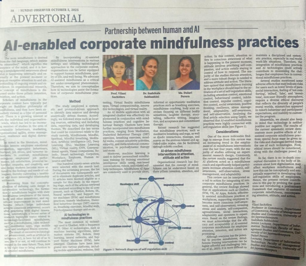 DIT Research Focus : An Article Co-Authored by Dr. Shashikala Subashini and Ms. Dulari Perera of the Department of IT together with Prof. Viani Sachithra from the Department of Commerce titled “AI-Enabled Corporate Mindfulness practices” was published in the Sunday Observer of 5th October 2025. You can read the full article here: https://www.sundayobserver.lk/…/ai-enabled-corporate…/