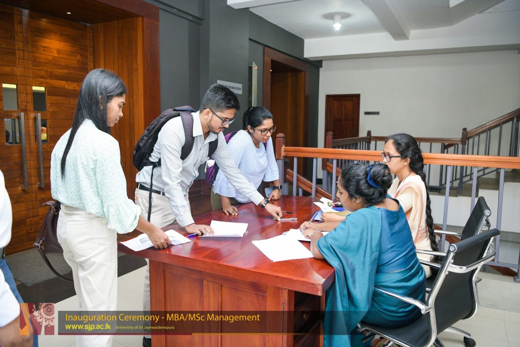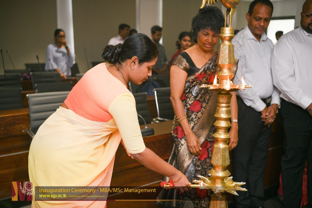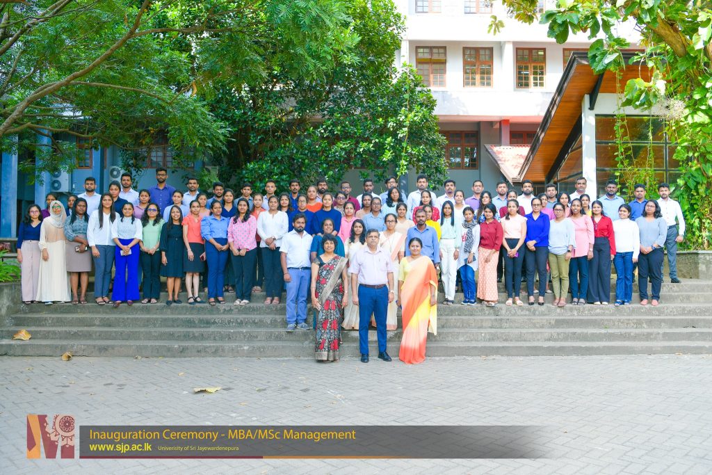The Inauguration Ceremony of the MBA/M.Sc. in Management Programme 2024 was successfully held on January 13, 2024, at the New Boardroom of Faculty of Management Studies and Commerce, University of Sri Jayewardenepura. The ceremony was led by Mr. Nalin B Karunaratne, Chief Executive Officer, Ceylon Biscuits Limited. Dr. Dushan Jayawickrama, Dean of the Faculty of Management Studies and Commerce, Prof. T.G.U.P. Perera, Chairman—of the Board of Studies in Management Studies, Prof. M.A.K. Sriyalatha, Coordinator—MBA Unit, and Ms. W.R.M. Shehani Shanika, Assistant Coordinator of the same Unit, graced the ceremony. Senior academics representing the lecture panel including one of the former Dean of the Faculty of Management Studies, Prof. Hilary Silva, and Chairman—of the Faculty of Postgraduate Studies in Management Prof. Wasantha Perera, Prof. Sudath Manjula Amarasena, Prof. M.D. Pushpakumari, Prof. Champa Rajapakse, and Mr. Daham Gunasena also participated and added more colour to the ceremony. A total of 100 candidates participated in the inauguration ceremony, representing diverse professional backgrounds.