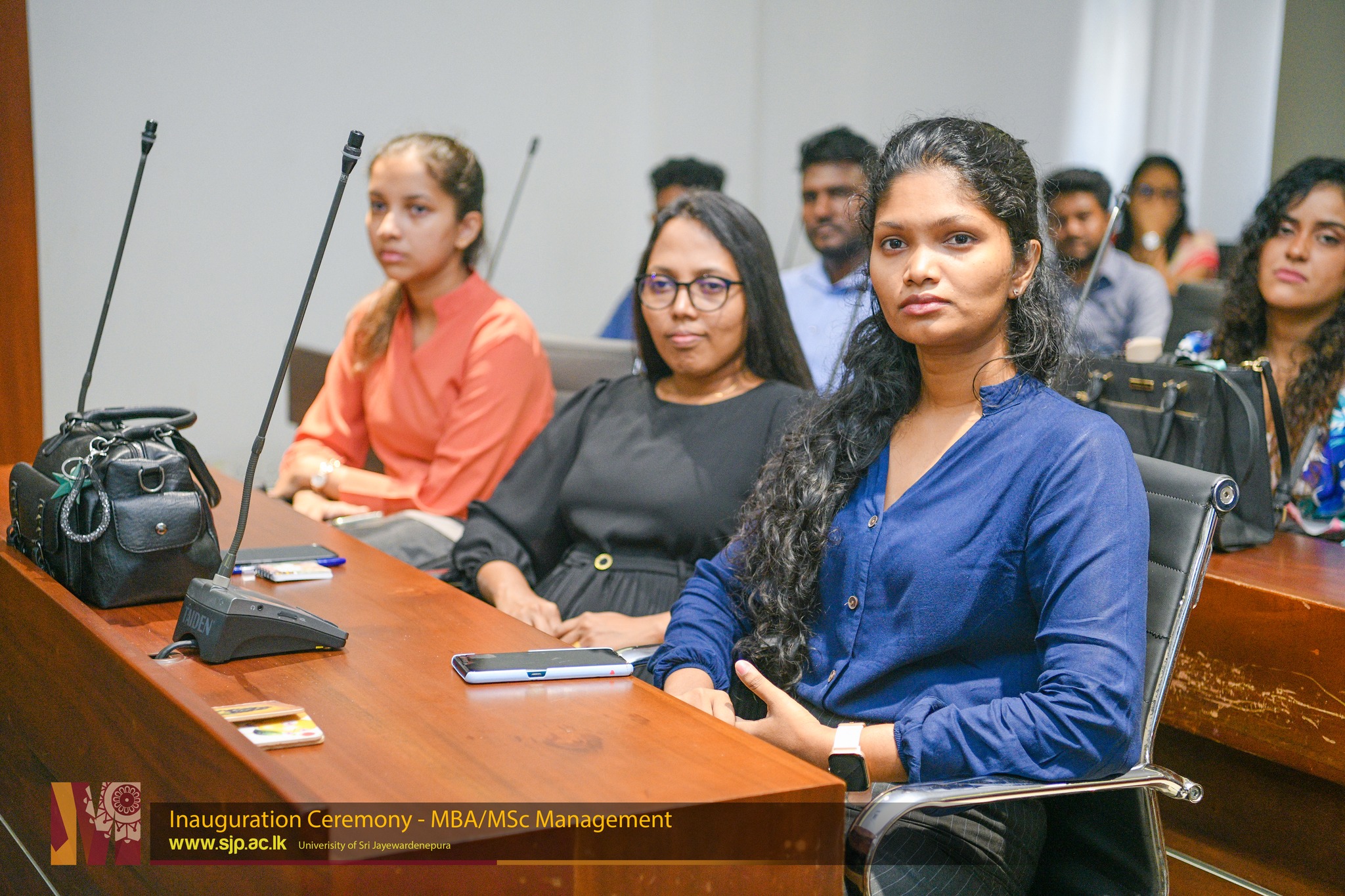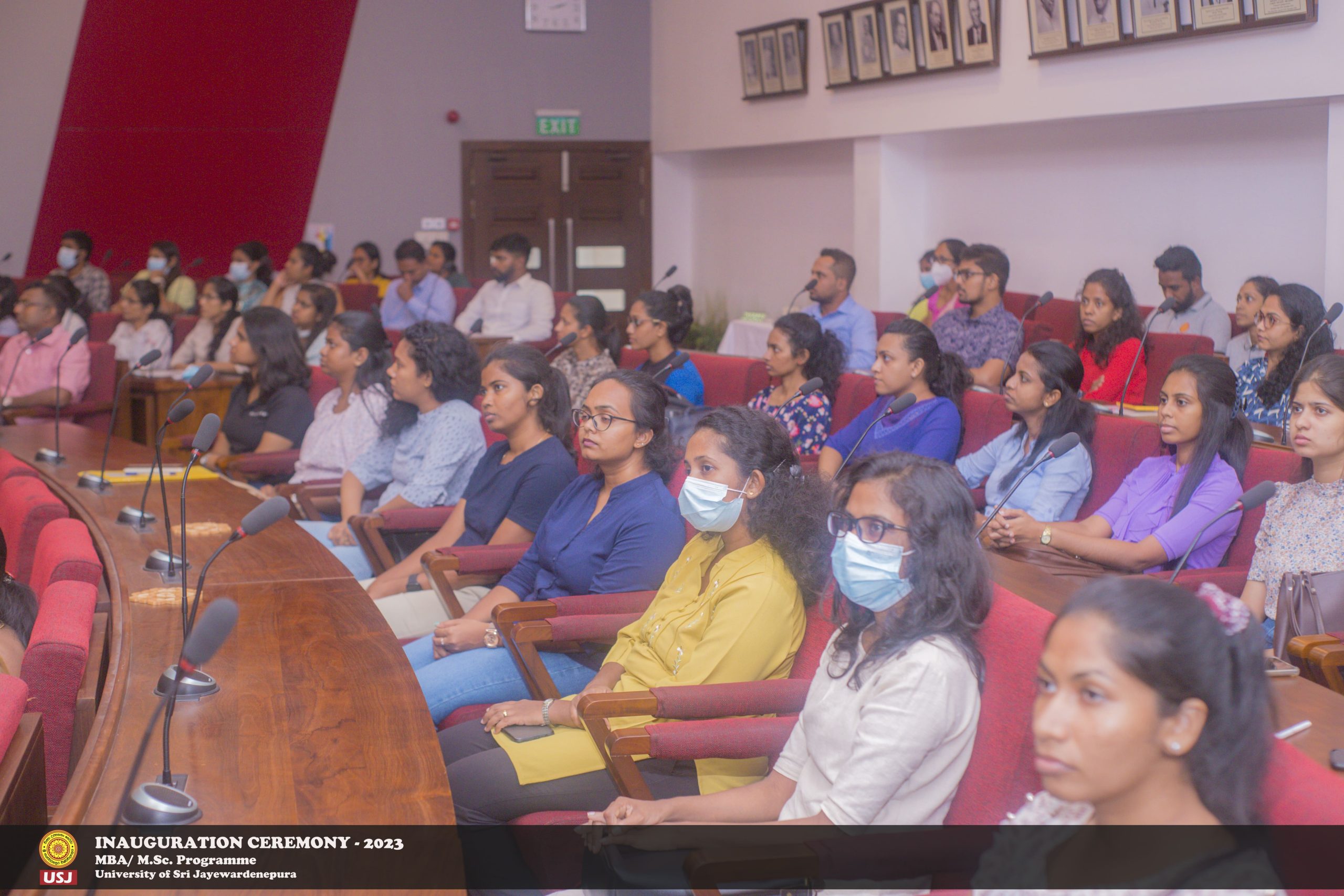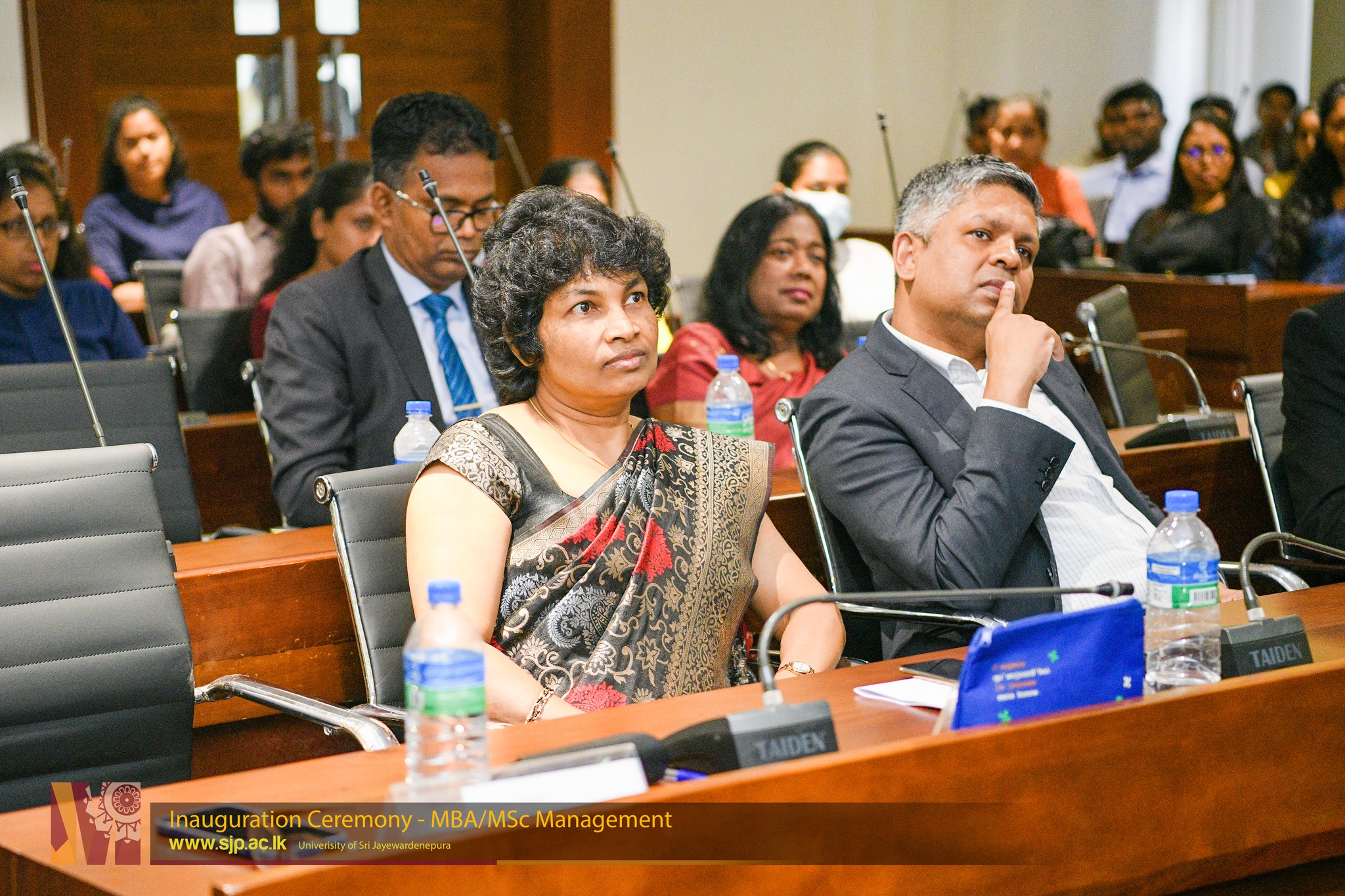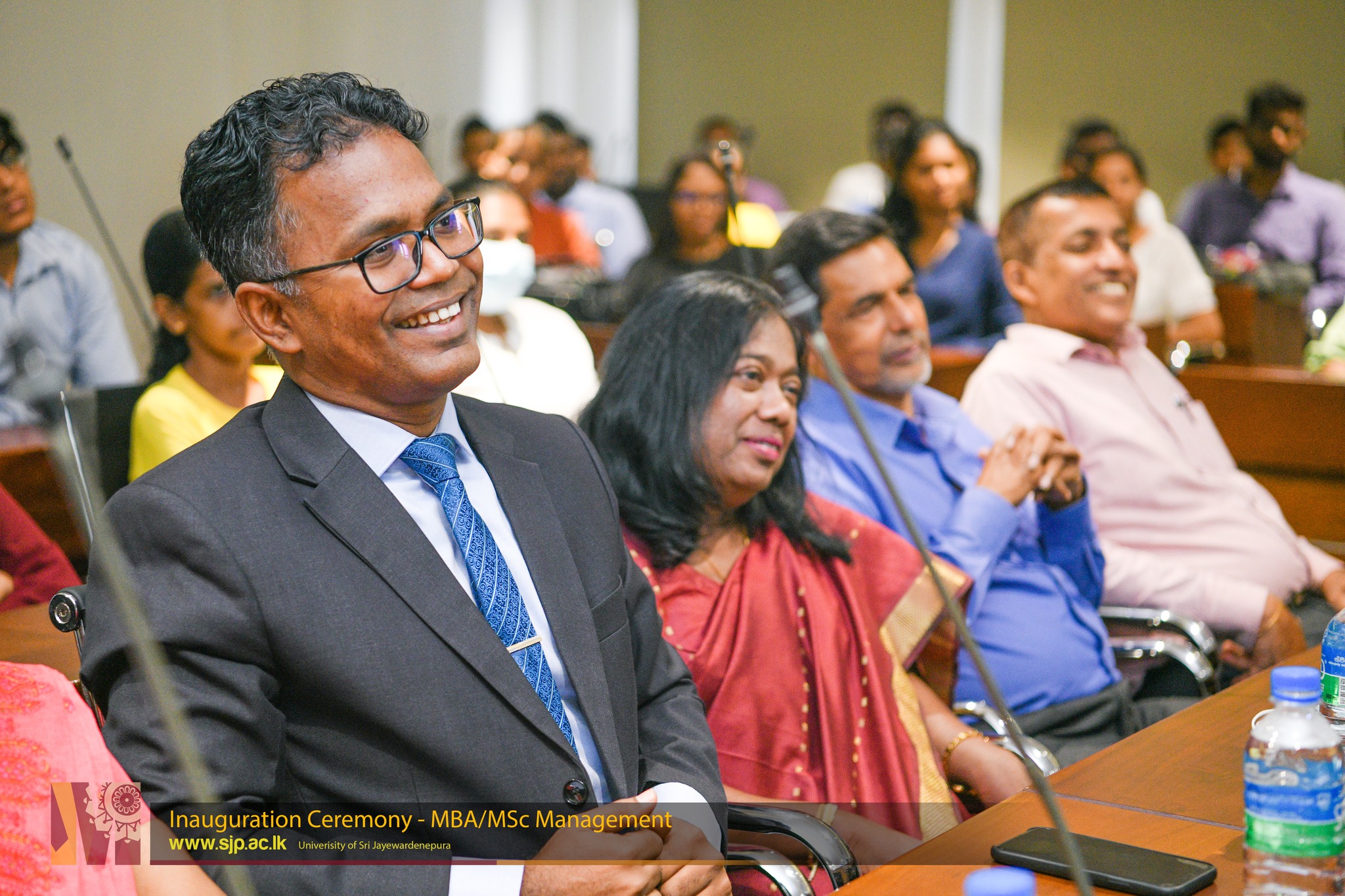 The Inauguration Ceremony of the MBA/M.Sc. in Management Programme 2023 was successfully held on February 19, 2023, at the Senate Boardroom of the University of Sri Jayewardenepura. The ceremony was led by Mr. Pushpika Janadeera, Managing Director of Dipped Products PLC and a proud J’pura MBA alumnus. He shared his experiences in the export market before, during, and after the COVID-19 pandemic, highlighting how his J’pura MBA expertise had fostered in his professional success. Prof. P.D. Nimal, Dean of the Faculty of Management Studies and Commerce, Prof. S.T.W. Saman Yapa, Chairman—of the Board of Studies in Management Studies, Prof. M.A.K. Sriyalatha, Coordinator—MBA Unit, and Ms. W.R.M. Shehani Shanika, Assistant Coordinator of the same Unit, graced the ceremony. Senior academics representing the lecture panel including Professor Aruna Shantha Gamage who was the former coordinator of the Unit also participated and added more colour to the ceremony. A total of 100 candidates participated in the inauguration ceremony, representing diversified professional backgrounds.