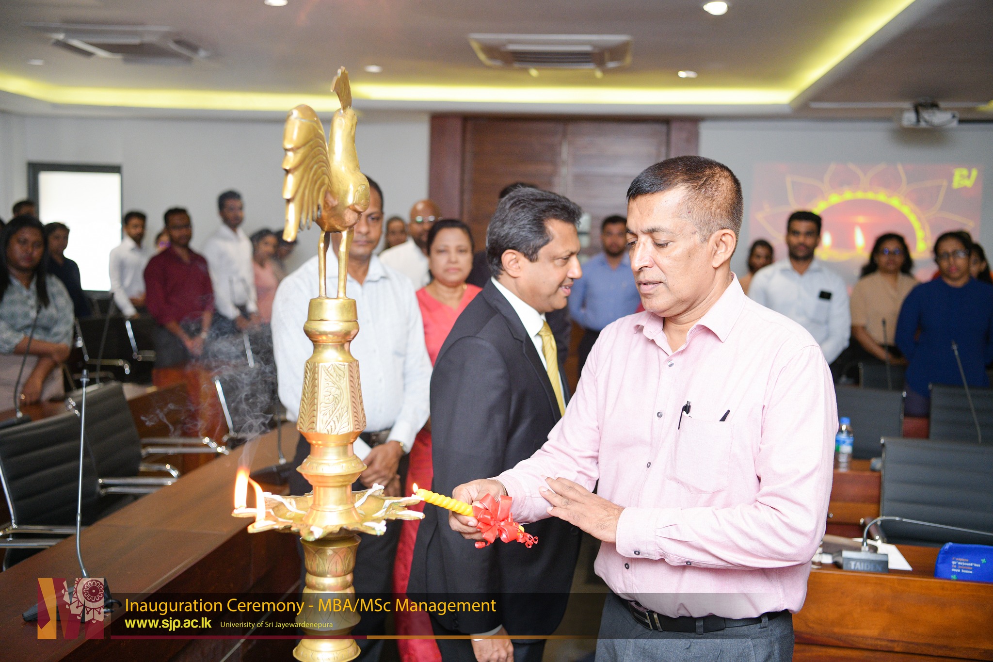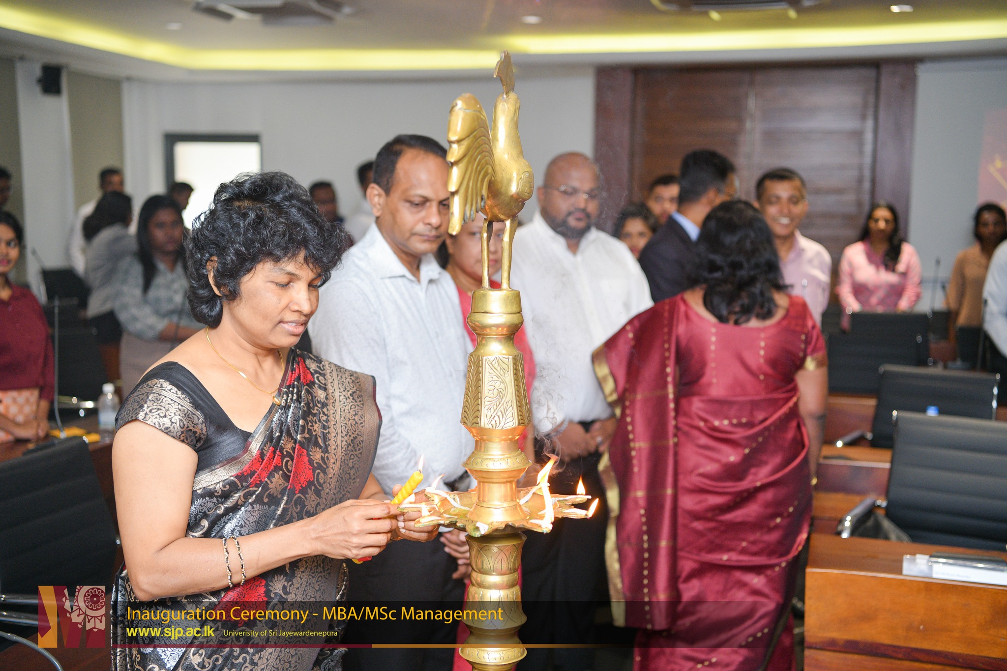 The Inauguration Ceremony of the MBA/M.Sc. in Management Programme 2024 was successfully held on January 13, 2024, at the New Boardroom of Faculty of Management Studies and Commerce, University of Sri Jayewardenepura. The ceremony was led by Mr. Nalin B Karunaratne, Chief Executive Officer, Ceylon Biscuits Limited. Dr. Dushan Jayawickrama, Dean of the Faculty of Management Studies and Commerce, Prof. T.G.U.P. Perera, Chairman—of the Board of Studies in Management Studies, Prof. M.A.K. Sriyalatha, Coordinator—MBA Unit, and Ms. W.R.M. Shehani Shanika, Assistant Coordinator of the same Unit, graced the ceremony. Senior academics representing the lecture panel including one of the former Dean of the Faculty of Management Studies, Prof. Hilary Silva, and Chairman—of the Faculty of Postgraduate Studies in Management Prof. Wasantha Perera, Prof. Sudath Manjula Amarasena, Prof. M.D. Pushpakumari, Prof. Champa Rajapakse, and Mr. Daham Gunasena also participated and added more colour to the ceremony. A total of 100 candidates participated in the inauguration ceremony, representing diverse professional backgrounds.