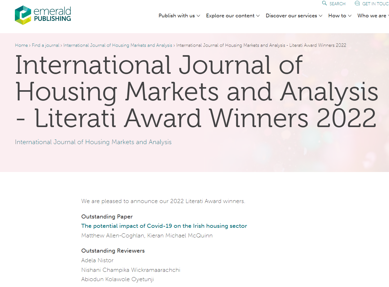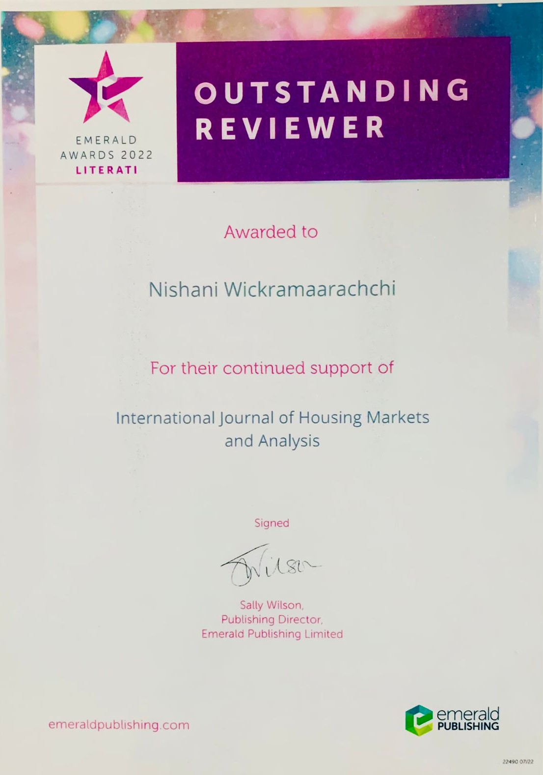 Professor. Nishani Wickramaarachchi from Department of Estate Management and Valuation, University of Sri Jayewardenepura has awarded with the Outstanding Reviewer in the “2022 Emerald Literati Awards” organized by Emerald Publishing. Professor Nishani was given this recognition for her continued support given as a Paper Reviewer for the International Journal of Housing Markets and Analysis.