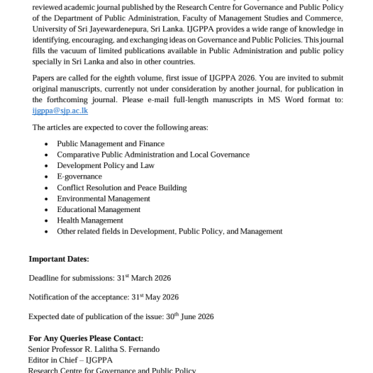 Extended abstracts are now called from the final year undergraduates of the Department of Public Administration who have successfully completed their undergraduate research in 2024. Submission Deadline : 30th November 2024 Click here to download the guideline for authors Click here to download the notice