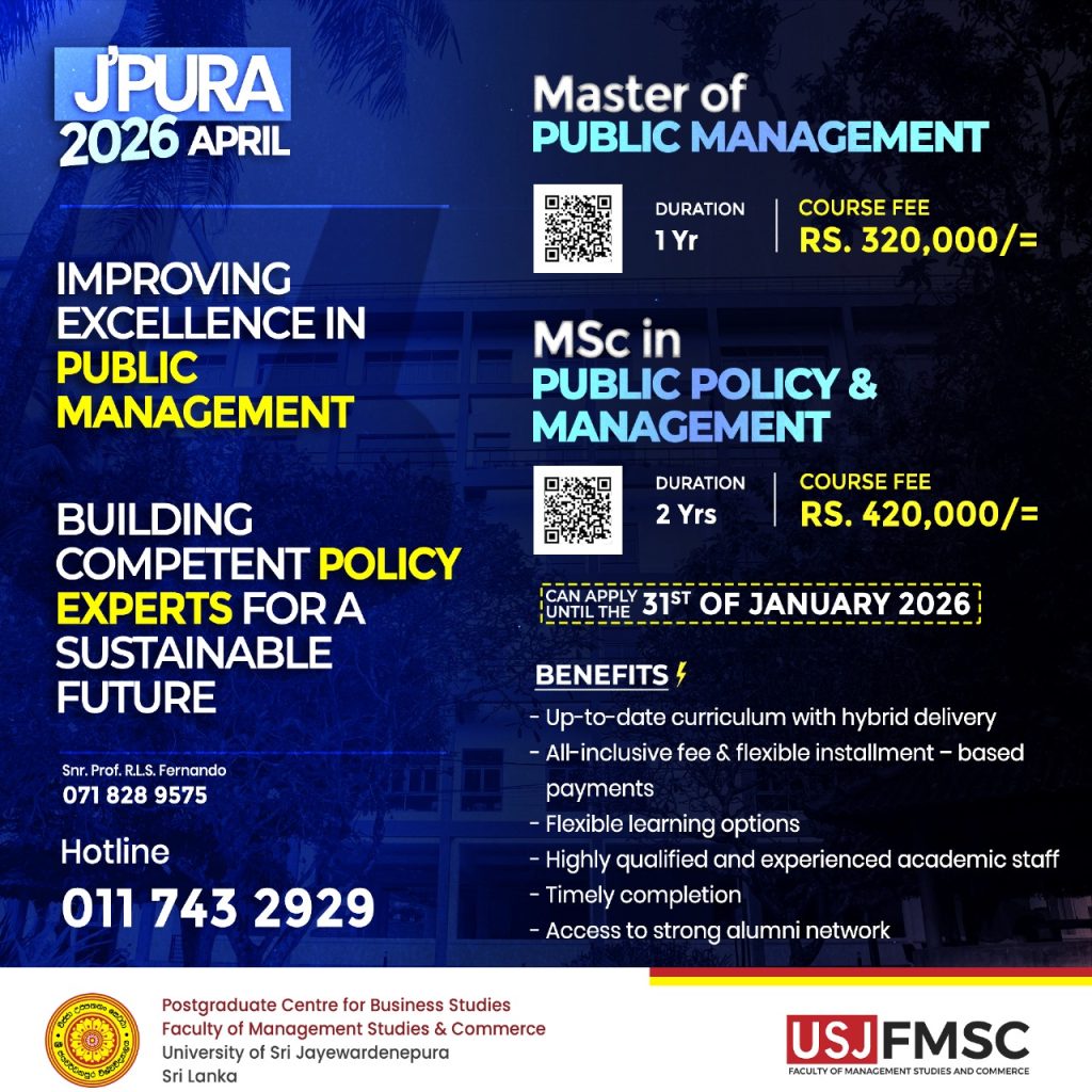 The Degree allows students to enhance their understanding of the theory and practice of Public Management and hopes to boost their performance as a manager / an administrator in their organizations. The programme is offered by the Faculty of Graduate Studies through the Department of Public Administration, Faculty of Management Studies and Commerce, University of Sri Jayewardenepura, Sri Lanka.